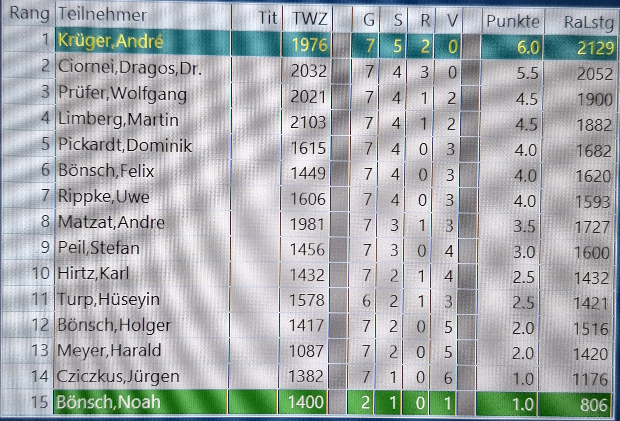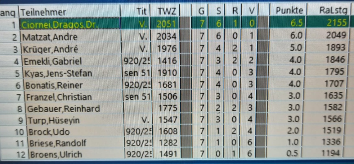 In lockerer Atmosphäre und bei weihnachtlichem Gebäck gab es 7 Runden, mit z T. sehr kuriosen Grundstellungen und entsprechenden Verläufen. Wir gratulieren dem Sieger André Krüger, knapp gefolgt vom ebenfalls ohne Niederlage spielenden Dragos Ciornei.