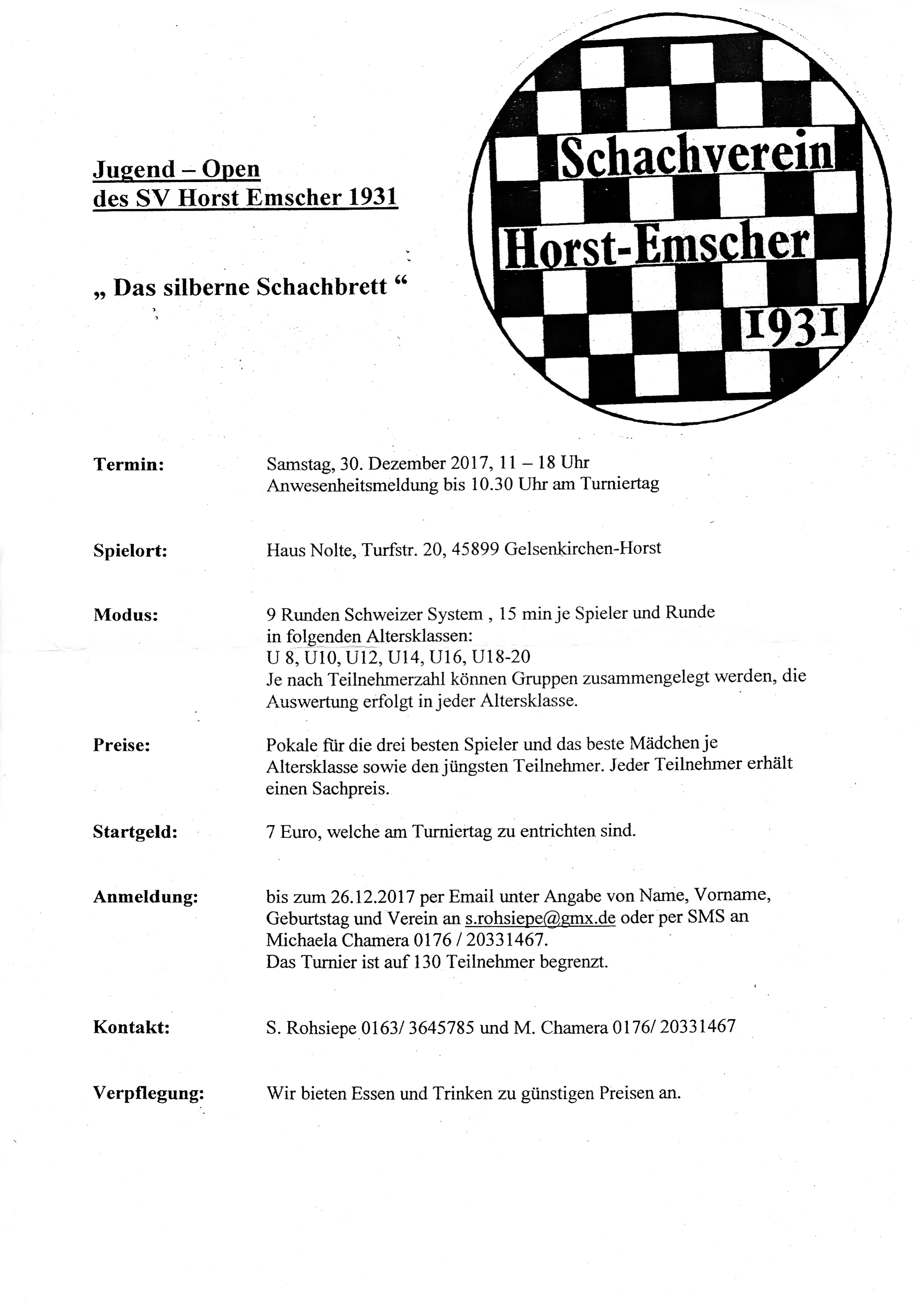 Am Samstag, den 30.12.2017, richtet der SV Horst-Emscher 31 sein traditionelles Jugendschnellschachturnier aus. Ich hoffe, dass auch aus unserer Jugendabteilung ein paar Jugendliche teilnehmen werden.