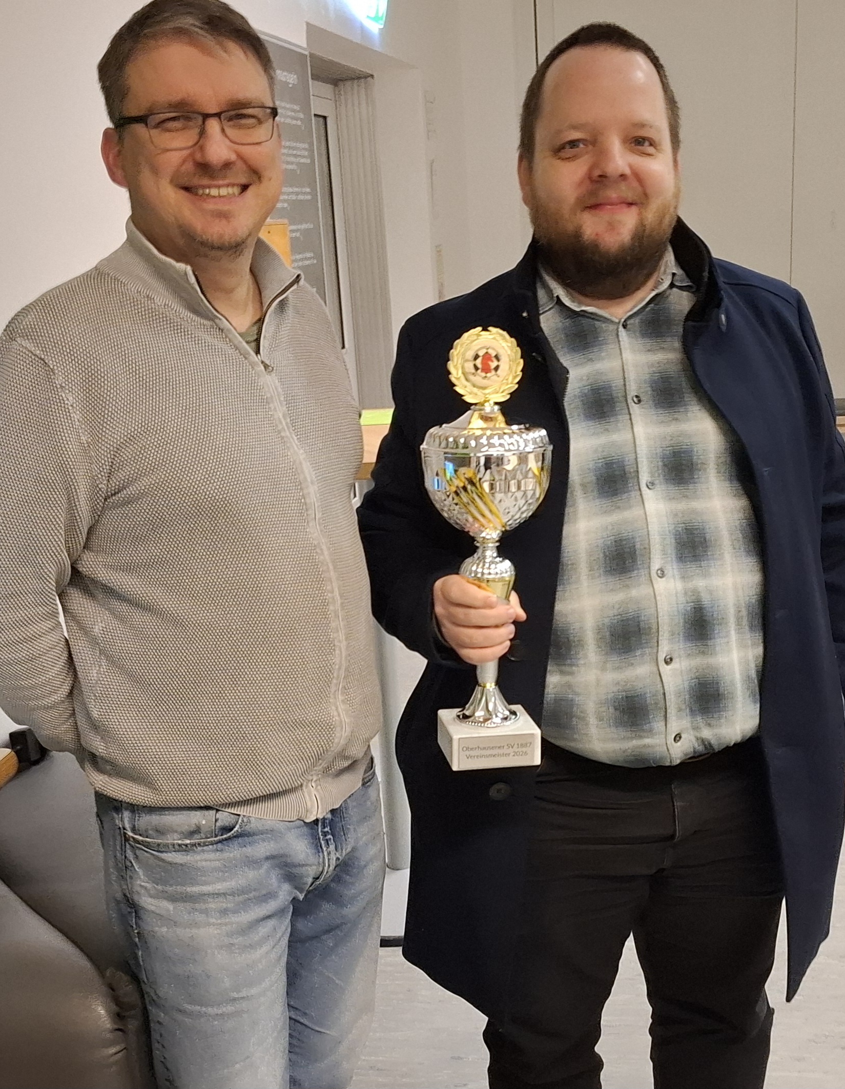 Am 13.01.2026 fand wie geplant die letzte Runde unserer Vereinsmeisterschaft statt. Und diese wurde spannender als so mancher vorab dachte: Tabellenführer Marcel beendete seine Partie relativ früh mit einem Remis. Dies gab seinem Verfolger CM Matthias Kiese die Möglichkeit, durch einen Gewinn seiner Partie doch noch den Titel zu holen, da Matthias eine Runde weniger gespielt und entsprechend eine bessere Zweitwertung vorzuweisen hatte. Nach langem Ringen musste Matthias aber zum Remis einwilligen, was die erfolgreiche Titelverteidigung für Marcel bedeutete – Glückwunsch Marcel Becker!