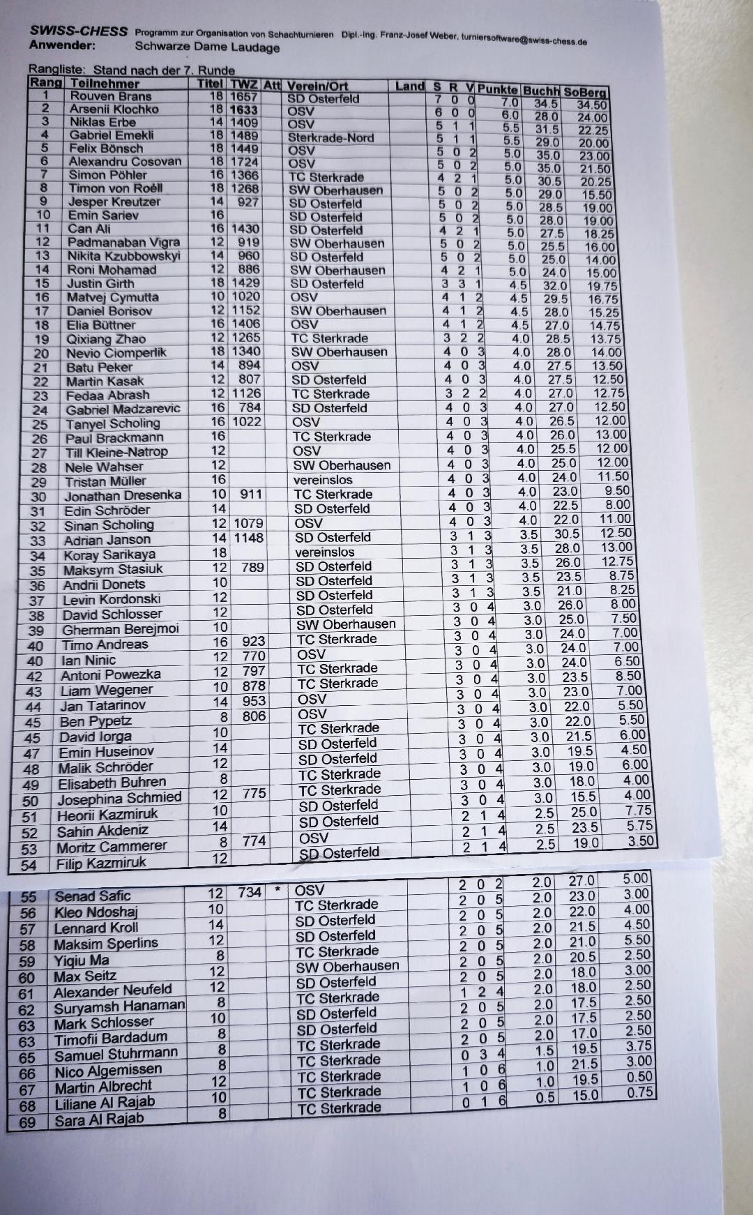 Im Gesamtklassement (69 Teilnehmer) verteidigte Rouven Brans (SDO, beim OSV Zweitmitglied) mit 7 aus 7 seinen Titel vor Arsenii Klochko (6 aus 6) und Niklas Erbe (5,5)  – beide OSV. Arsenii konnte erst in der zweiten Runde einsteigen.